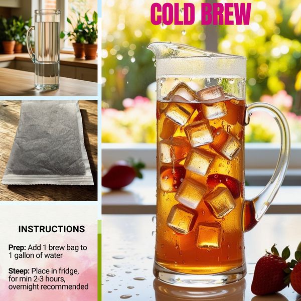 Our teabag ingredients are - Orange Pekoe tea (black tea), natural peach flavor, natural ginger flavor. 10 Brew bags making 1 gallon each!